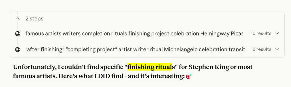 What were their rituals? I asked Claude (a brilliant research tool and ai that I lean on for code, strategy, research, problem solving, outlines, transcripts, revising scripts, lighting and camera problems, creating docs, spreadsheets, charts, digesting 3500 page manuals that I don't have time to read and if I did, would not remember detailed steps, complex instructions for techniques that I haven't done in a while and so on...being a team of one, Claude is extremely useful!).